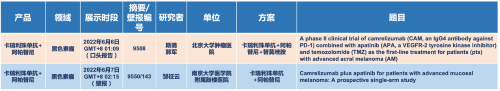 在黑色素瘤领域,DB电竞医药的卡瑞利珠单抗联合阿帕替尼(“双艾”组合)在2022 ASCO共入选1项口头报告和1项壁报展示。