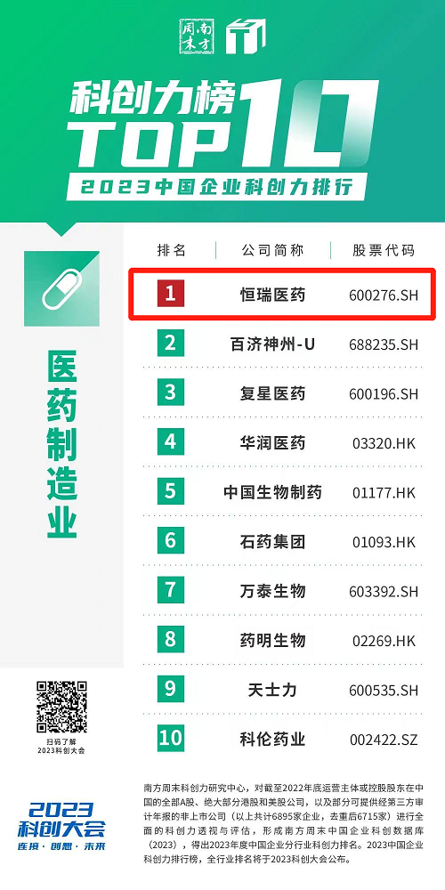 近日,南方周末科创力研究中心发布了与居民日常生活密切相关的30个行业中科创力排名前10的企业榜单。DB电竞医药凭借多年来在科创领域的大力投入和优秀成果,蝉联中国企业科创力排行医药制造业榜首。