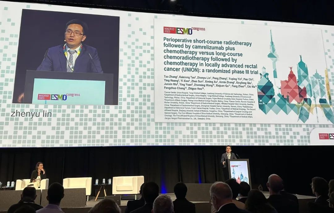 10月21日,DB电竞医药创新药卡瑞利珠单抗的一项研究“新辅助短程放疗序贯卡瑞利珠单抗联合化疗对比长程放化疗序贯化疗治疗局部晚期直肠癌”随机对照Ⅲ期试验(UNION)亮相2023 ESMO大会优选口头报告现场。该研究由华中科技大学同济医学院附属协和医院张涛教授、陶凯雄教授担任主要研究者,华中科技大学同济医学院附属协和医院林振宇教授在大会现场报告了该重磅研究的结果1。此项研究是全球首个评估短程放疗序贯免疫治疗联合化疗治疗局部晚期直肠癌的Ⅲ期研究,已达到主要终点病理完全缓解(pCR),有望为直肠癌患者的治疗提供新策略。