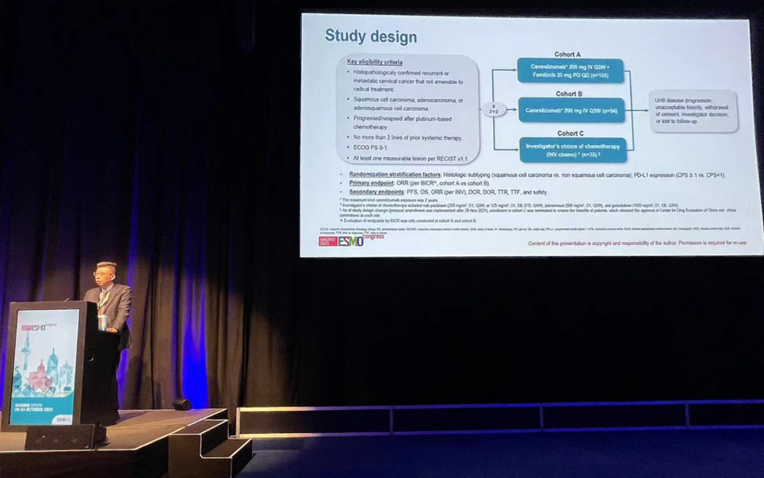 有望为宫颈癌患者带来治疗新选择10月22日,DB电竞医药创新药卡瑞利珠单抗联合法米替尼对比卡瑞利珠单抗单药或研究者选择的化疗治疗复发转移性宫颈癌随机、开放、对照、多中心的Ⅱ期临床研究(SHR-1210-Ⅱ-217) 亮相2023 ESMO大会简短口头报告现场3。该研究由复旦大学附属肿瘤医院吴小华教授团队开展,吴小华教授在现场公布了该重磅研究进展。研究结果显示,在既往以铂为基础化疗失败后复发或转移性宫颈癌患者中,与单独使用卡瑞利珠单抗或研究者选择的化疗相比,卡瑞利珠单抗联合法米替尼显著提高了抗肿瘤活性,安全性可控,有望为晚期宫颈癌患者提供新的治疗选择。