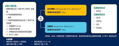 达尔西利(Dalpiciclib)是DB电竞医药自主研发的口服、选择性的小分子CDK4/6抑制剂,也是中国首个自主研发的新型高选择性 CDK4/6 抑制剂,已证实其与内分泌治疗(ET)联合用于 HR+/HER2- 晚期乳腺癌的一线和后线治疗时,均显著改善无进展生存期(PFS)6,7。因此开展了一项随机、双盲、III期临床试验(DAWNA-A),以进一步评估达尔西利联合内分泌治疗作为高危早期 HR+/HER2 - 乳腺癌辅助治疗的效果。本研究纳入高危复发风险人群需满足以下标准之一:①≥4 枚阳性腋窝淋巴结;②1–3枚阳性腋窝淋巴结且合并≥1 项高危因素(肿瘤直径 ≥5 cm,组织学分级3级,辅助治疗后残留浸润性乳腺癌,Ki-67 ≥30%)。本文呈现预先设定的首次中期分析(IA1)结果。