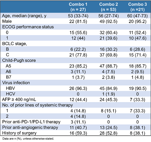 在联合队列1、2和3中,受试者的中位年龄分别为53、56和60岁,大部分受试者存在乙型肝炎病毒(HBV)感染,大部分受试者的BCLC分期为C期。联合对列1中,3例(11.1%)受试者既往接受过抗PD-1/PD-L1抗体治疗,11例(40.7%)受试者既往接受过抗血管生成药物治疗。联合队列2中,13例(24.5%)受试者既往接受过抗血管生成药物治疗。联合队列3中,8例(38.1%)受试者既往接受过抗血管生成药物治疗。研究纳入的晚期HCC患者符合中国肝癌人群特征。
