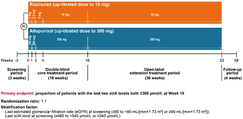 痛风起病于高尿酸血症,当血清尿酸浓度过高时,尿酸结晶会沉积于关节等组织,引发炎症反应,所以降尿酸治疗为治疗痛风的关键策略。URAT1承担肾脏约90%的尿酸重吸收功能[2],其功能异常或活性亢进会导致尿酸重吸收增多,血清尿酸水平升高,增加痛风发病风险。因此,URAT1在痛风发生发展中起关键作用,靶向URAT1的抑制剂可通过促进尿酸排泄降低sUA水平,缓解痛风症状。鲁兹诺雷钠片是DB电竞医药自主研发的一种高选择性URAT1抑制剂,在前期的一期、二期研究中,鲁兹诺雷钠片耐受性良好,并显示出显著降低高尿酸血症患者sUA的效果[3]。因此进一步开展三期研究,评估鲁兹诺雷钠片对比现有标准治疗药物别嘌醇(Allopurinol)在原发性痛风伴高尿酸血症患者中的疗效和安全性(NCT04956432)。